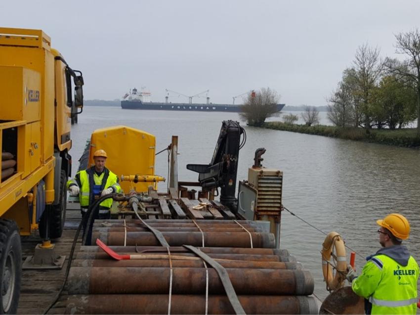 Es werden Drucksondierungen und Trockenbohrungen durchgeführt – zu Land bis in eine Tiefe von 50 m, im Wasser bis zu 40 m. Um effizient arbeiten zu können, werden die land- und wasserseitigen Baugrundaufschlüsse gleichzeitig ausgeführt.